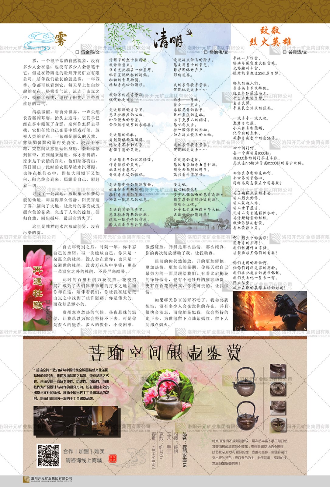 洛陽開元礦業(yè)集團(tuán)有限公司簡介洛陽開元礦業(yè)集團(tuán)有限公司,始成立于2006年,位于洛陽市開元大道269號。集團(tuán)旗下共有五余家全資子公司,業(yè)務(wù)涉及有色金屬礦山開發(fā)、礦產(chǎn)品購銷與進(jìn)出口貿(mào)易、房地產(chǎn)開發(fā)、文化藝術(shù)、企業(yè)管理與咨詢、資本投資等多個(gè)領(lǐng)域。民建河南省委委員、民建河南省委企業(yè)委副主任、民建洛陽市委委員、企業(yè)委主任、洛陽民建企業(yè)家協(xié)會(huì)會(huì)長許明月是公司創(chuàng)始人,現(xiàn)任洛陽開元礦業(yè)集團(tuán)有限公司董事長。在礦業(yè)領(lǐng)域,洛陽開元礦業(yè)集團(tuán)擁有多家實(shí)力雄厚的子公司:貴州開元礦業(yè)有限公司探、采礦權(quán)面積共11.33平方公里;興??h銅鑫礦業(yè)有限公司探礦權(quán)面積8.76平方公里,礦山資源潛力巨大;2021年,開元集團(tuán)與盧氏中科礦業(yè)有限公司開展戰(zhàn)略合作。盧氏中科礦業(yè)有限公司專注于有色金屬的浮選、加工和銷售,擁有強(qiáng)大的技術(shù)支撐平臺,是集探、采、選、冶、研為一體的中大型綜合礦業(yè)企業(yè)。目前,盧氏中科王家河1000噸選礦廠已成功投產(chǎn),雙河金礦、柳關(guān)欒盧鉛鋅礦相繼順利開工,樓房銀礦與圪老灣鉛鋅礦的深部探礦重大突破,標(biāo)志著礦山版圖取得重大進(jìn)展,為開元集團(tuán)后續(xù)發(fā)展奠定了堅(jiān)實(shí)基礎(chǔ)。在文化傳媒領(lǐng)域,洛陽市明月美術(shù)館通過豐富多樣的藝術(shù)展覽、學(xué)術(shù)研討和公共教育活動(dòng),努力打造一個(gè)集展覽、交流、教育、研究為一體的綜合性藝術(shù)平臺。此外,在金融投資領(lǐng)域,開元集團(tuán)旗下的北京明峰資本管理有限公司專注于投資具有高增長潛力的優(yōu)秀企業(yè),特別是高科技、新能源、環(huán)保等新興產(chǎn)業(yè),為客戶提供個(gè)性化的資產(chǎn)配置服務(wù)。在做好企業(yè)經(jīng)營的同時(shí),開元集團(tuán)始終不忘企業(yè)的社會(huì)責(zé)任和家國情懷,以突出的愛心公益事跡,開展了一系列公益慈善活動(dòng):“民建林”公益事業(yè)通過“思源基金”“幫幫公益”線上公益平臺,與眾多愛心人士籌措資金20余萬元;資助541名貧困大學(xué)生共計(jì)270余萬元,推進(jìn)“數(shù)字助力——河南AI人才培養(yǎng)”;捐款10萬元,馳援京津冀、黑龍江洪水地質(zhì)災(zāi)害……公司于2017年底被洛陽市慈善總會(huì)評為“洛陽慈善風(fēng)云榜——十大愛心集體”。洛陽開元礦業(yè)集團(tuán)有限公司秉承持續(xù)發(fā)展理念,憑借多年來良好的企業(yè)信譽(yù)與經(jīng)營業(yè)績,與全國多家企業(yè)建立了良好合作關(guān)系,受到社會(huì)各界的一致好評,多次榮獲“納稅標(biāo)兵”“先進(jìn)企業(yè)”“招商引資模范企業(yè)”等榮譽(yù)稱號?;赝麃頃r(shí)路,開元人勠力同心,以“闖”的精神和“創(chuàng)”的勁頭,一路披荊斬棘,踏過千山萬水;展望新未來,開元人凝心聚力,不執(zhí)于“舊”,無畏于“新”,秉承“勇于跨越,追求卓越”的企業(yè)精神,乘著國家高質(zhì)量發(fā)展新征程的東風(fēng),跨過高山,越過大海,向著集團(tuán)多元化、國際化的目標(biāo),逐夢遠(yuǎn)航,跨越前行!